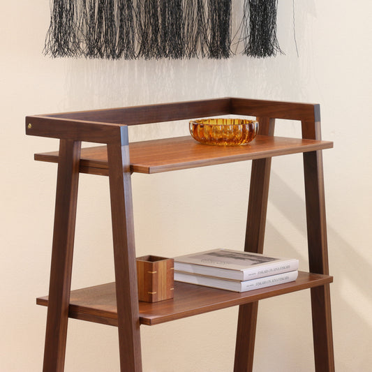 The Kantti collection is designed and manufactured by Deka in Australia. It includes a desk, a stool, an armchair and a shelving unit.