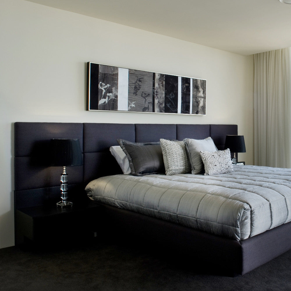 Each bed is custom designed and made in a range of finishes, to the customer's ergonomic requirements, and to suit the customer's mattress size. As mattress thicknesses range from the thin latex to the thick sprung types, we consider this and adjust the proportions of the desired design to suit. The customer has a choice of timber and fabric finishes and a variety of side table and bedhead style to chose from, and we make all sizes from single to king in any of our designs. All of our beds feature custom posturepeadic slats. We provide an on-site measure up service and compete the project with delivery and installation to ensure no conflict with existing powerpoints.